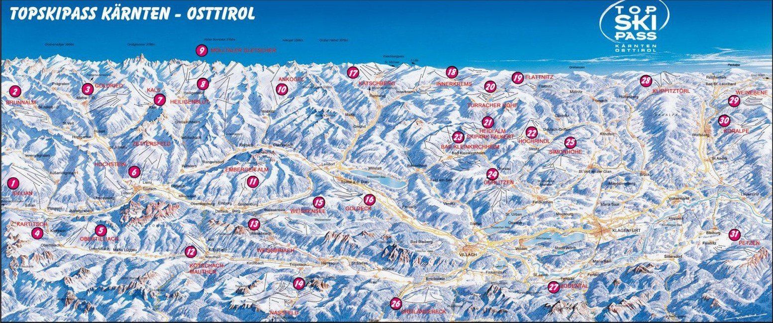 Od priestranného jazera Nassfeld - Pressegger See cez veľkolepý Heiligenblut, ktorý sa nachádza pod Grossglocknerom, až po známy Bad Kleinkirchheim alebo celoročne otvorený ľadovec Mölltal - skipas pokrýva celú rozmanitosť južného alpského regiónu. Súčasťou ponuky sú aj menšie oblasti vhodné pre rodiny, ako napríklad Sillian, Obertilliach alebo Katschberg.